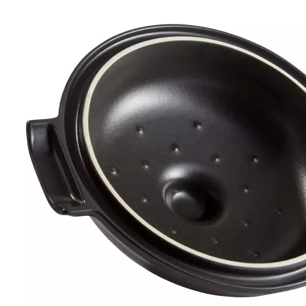 Keramik zum Kochen und Braten bietet den Vorteil, dass die Wärme gleichmäßig verteilt wird, das Fleisch schonend gegart wird und sich die Aromen besonders entfalten können. Durch die Noppen an der Innenseite tropft das Kondensationswasser gleichmäßig auf das Bratgut und macht es saftig und zart.