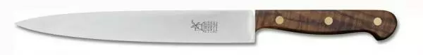 Windmühlenmesser Tranchelard 1922 und Griffen aus Walnussholz, nicht-rostfrei und mit HRC 60 Klinge. Getreu dem Original des Jahres 1922 wurde diese Neuausgabe des historischen Kohlenstoffstahlmessers mit schmalem Kropf aufgelegt. Die Klinge hat eine Härte von 60 Rockwell.