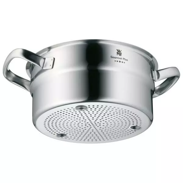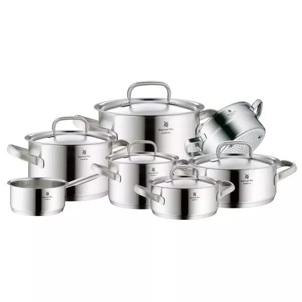 WMF Kochtopf-Set Gourmet Plus, 7-teilig. Hochwertiges Topfset. Bestehend aus zwei Bratentöpfen (16 und 20 cm), drei Fleischtöpfen (16, 20 und 24 cm) mit Deckeln sowie einer Stielkasserolle (16 cm) und einem Dünsteinsatz (20 cm).