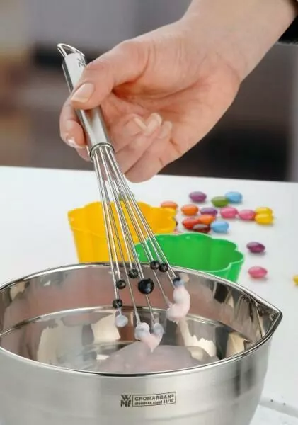 WMF Rührblitz Profi Plus, silikonbeschichtet. Durch das Eigenschwingungen der Silikon-Kugeldrähte gelingt das Anrühren von Saucen, Suppen oder Aufschlagen von Cremes ohne Klümpchen.