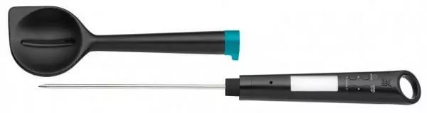 Der Thermo-Kochlöffel aus der Serie Hello FUNctionals ist Rührer und Messer in einem. Der Kochlöffel verfügt über ein integriertes Braten- und Allzweckthermometer und misst somit z.B. die Temperatur beim Rühren. Die Besonderheit ist, das beim Erreichen der min. oder max. Temperatur ein akustisches Signal ertönt. Zusätzlich verfügt der Kochlöffel über einen Küchentimer. Dank dem mitgelieferten Ablagebänkchen wird eine saubere Koch- und Arbeitsfläche ermöglicht. Der praktische, multifunktionale und platzsparend aufzubewahrende Küchenhelfer für jede Küche.