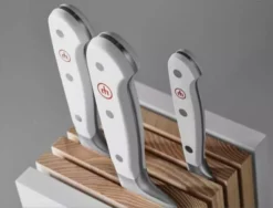 Wüsthof Messerblock Classic White mit 5 Teilen. Gut geschützt und immer griffbereit bewahren Sie Ihre Messer im Holzblock aus Buchen- und Eichenholz auf. Ein Blickfang in jeder Küche. Dank der schräg abgeflachten Form des Messerblocks können die Messer mit einer Handbewegung einfach entnommen und wieder in die praktischen Schubfächer gesteckt werden.