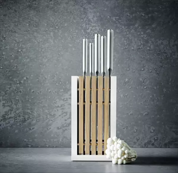 - Material Messerblock: Material Messerblock: Innenteil aus geöltem Eichenholz, Korpus aus weiß lackiertem Buchenholz