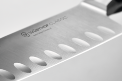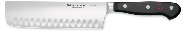Wüsthof aus der Serie Classic mit Kullenschliff. Das Nakiri ist das japanische Gemüsemesser. Als solches ist es extrem vielseitig und eignet sich für Aufgaben wie Schneiden, Würfeln oder Hacken. Von der Form her erinnert es ein wenig an ein Hackebeil, darf mit diesem aber nicht verwechselt werden. Ein Nakiri eignet sich nicht für grobe Aufgaben (z.B. das Zerteilen von Knochen). Die sehr scharfe und fein geschliffene Klinge hilft viel eher dabei, Gemüse, Kräuter und Obst sehr schnell, aber auch sehr filigran zu verarbeiten. Der Kullenschliff (kleine Vertiefungen im Klingenblatt, die beimSchneiden kleine Luftpolster bilden) des Messers verhindert zudem ein Anhaften der Zutaten.