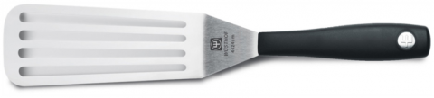 Palette Silverpoint mit Schlitzen, 12 cm. Durch die abgewinkelte Form eignet sich die Palette zum Abheben fast aller Gerichte, die in der Pfanne oder auf dem Backblech zubereitet werden. Die langen Schlitze lassen Fett und andere Flüssigkeiten leicht abtropfen.