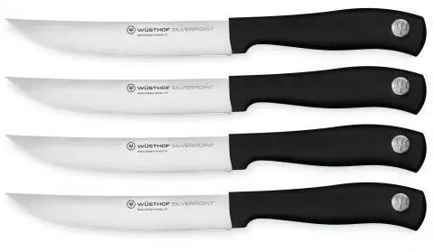 Wüsthof Steakmessersatz Silverpoint. Das Messer-Set besteht aus vier Steakmessern. Ein gutes Steak-Messer ist für den Fleischliebhaber unverzichtbar! Die extrascharfe Klinge des Steakmessers wird nicht nur einem guten Rindersteak gerecht, sondern schneidet auch alle anderen Fleischsorten, ohne die Fasern zu zerreißen. Es gehört damit immer auf Tisch oder Tafel, wenn Fleisch auf dem Speiseplan steht.